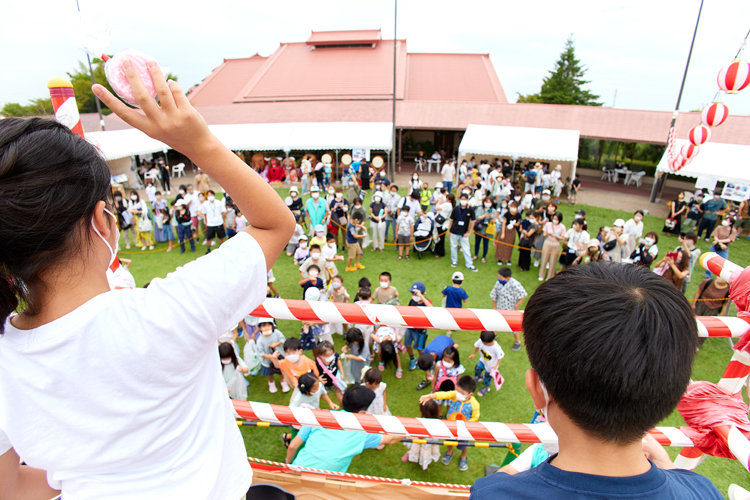 会場の複合施設には日本最大級の産地直売所があり、普段から家族連れが多く、特に土日は買い物客などで終日混み合う場所。お囃子や餅まきの他に、祭りにつきものの射的やスーパーボールすくいなども用意され、子どもから大人まで1000人ほどが夏休み最後の週末を楽しんだ。