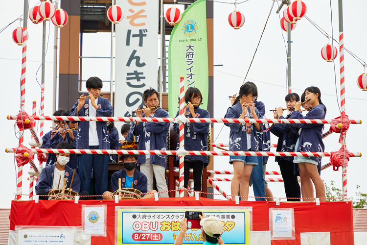 大府(おおぶ)市にあるJAあぐりタウンげんきの郷の芝生広場で8月27日、「OBUおはやしフェスタ」が開かれた。この催しは、大府ライオンズクラブ(加古丞二会長/60人)が結成50周年記念事業の一つとして開催した。サブタイトルには「大府のおまつり再発見」とあり、地域の伝統的な行事の中から子どもが楽しめそうな要素が数多く盛り込まれている。例えば、市内四つの神社の祭礼などでお囃子(はやし)を奏でる6団体による演奏や、小学生限定の餅まき大会など、秋祭りの雰囲気を楽しみながら地域の文化や歴史に触れられる内容だ。前日まで雨の予報で開催が危ぶまれたが、当日は一度も降られることなく実施された。