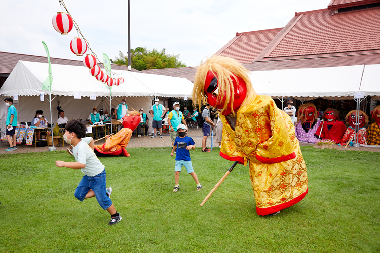 さまざまな催しでにぎわう会場では、時折、あちらこちらから子どもの悲鳴が聞こえてきた。悲鳴が上がった場所には必ず赤い顔をした大人形がゆらゆらと立っている。市内の神社の祭礼に福神として登場する「猩々(しょうじょう)」だ。猩々が持つ竹の棒で頭を触られると福と徳を授かると言われ、親は子どもを猩々の元へ連れて行こうとするのだが、子どもは怖がって悲鳴を上げて逃げ回る、というわけだ。市内の神社の猩々が一カ所に集まることはめったにないそうで、このイベントならではの光景だ。
