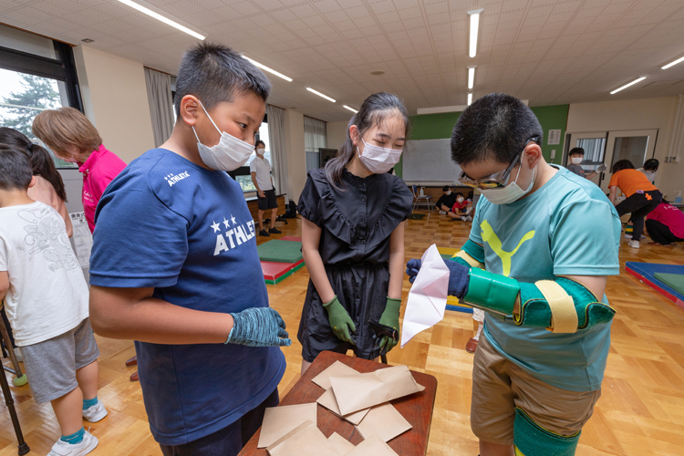 嶋田委員長から手順の説明があった後、児童全員が一人ずつ順番に体験する。まず、ライオンズ・メンバーが児童の体に高齢者疑似体験用セットを装着。重りと眼鏡の他に、ひじとひざを曲げにくくするサポーターや、指先の感覚を鈍らせる軍手を身に着ける。装置を着けた体験者1人に介助者役の児童2人が付き添って、体験がスタート。段差のあるマットレスの上を歩いた先には、封筒を置いた机がある。軍手をはめた手で封筒からトランプのカードを取り出し、その先に並んだカードの中から同じ数字を探す、というのが一連の流れだ。