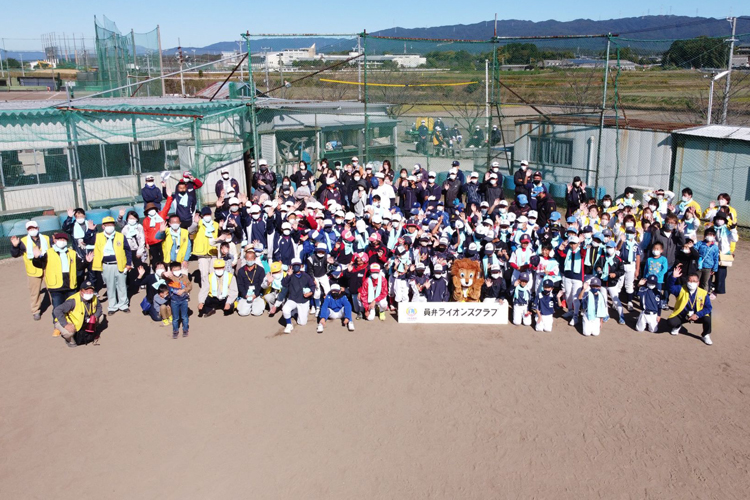 当日の11月6日は、美しい秋晴れの絶好の清掃日和。この日はまず午前8時半から、中学硬式野球チーム・桑員ボーイズの専用球場で員弁ライオンズクラブ旗争奪新人大会が行われた。開会式での選手宣誓は見事で心を打たれるものだった。そして試合後、員弁川堤防周辺の清掃活動へと移行。石垣会長の開会あいさつ、出口紀幸記念事業実行委員長からの説明の後に作業がスタートした。地元・三重テレビの「ニュースウィズ」の中継も入った。
