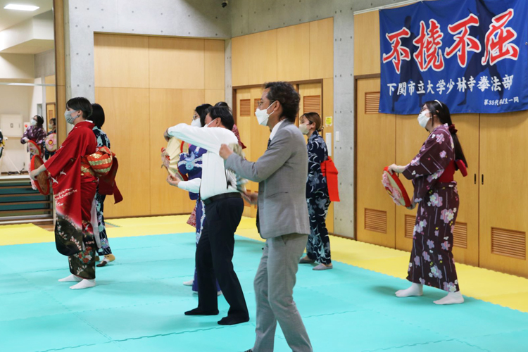 そして11月7日、満を持しての対面での実施。参加者を公募したところ12人の応募があった。当日は下関邦舞連盟所属の花柳流名取の先生方に協力いただき、紋付き袴や振袖の着付け、和服を身に着けた時の立ち居振る舞い等について指導を受けた後、山形県民謡「花笠音頭」の踊りを教わり、我々ライオンズ・メンバーも一緒に踊って交流を深めた。