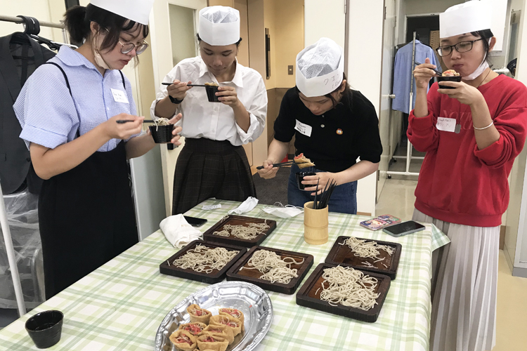 ベトナムには、とても豊かな麺食文化があるが、フォーやブンなどの米粉麺が多い。そば粉の麺や、自分の手で粉をふるいにかけるところからの体験はみんな初めてだった。江戸ソバリエ協会などから指導者8人の応援を得て、グループに分かれて「水回し→コネ→延(の)し→たたむ→切る」といった作業を行った。大きな包丁で均等な太さに麺を切る際には苦戦を強いられ、ゆであがった時に少し固いものも混ざっていたのはご愛敬。それでも、それぞれ自分たちが手作りしたそばが一番おいしいと、皆笑顔で食べていた。また先生の厚意で、そば稲荷も作った。