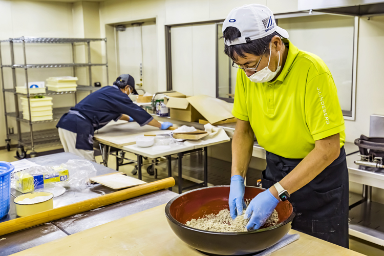 とはいえ、打ち手以外にもやるべき仕事は山ほどある。当日振る舞うそばは、施設利用者と職員の分を合わせると約50人分にもなる。おかわりを見越して100食は用意しなければならない。そのため、前日の23日午後、町内にある貸し調理室に打ち手を始め数人のメンバーが集まった。前日のうちにそばを打っておき、そばつゆは貫田さんが自宅で手作りして、翌日オークルに持ち込む手はずだ。