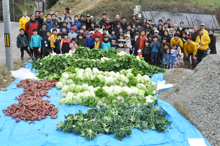 2022年11月20日には、ラグビースクールの子どもたちと保護者ら90人、クラブ・メンバーと家族30人が集合。メンバーの降矢敏朗さんの農園で、この日のために育てられたダイコン、ハクサイ、サツマイモ、ブロッコリーの収穫作業に汗を流した。子どもたちは大きく育ったダイコンを土の中から引き抜いたり、サツマイモを掘り出したりする度に歓声を上げた。畑から広場へと野菜を運ぶ作業では、まるで大きなラグビーボールのようなハクサイを、親子が並んで声をかけ合いながら丁寧に受け渡すチームワークの良さも見せた。