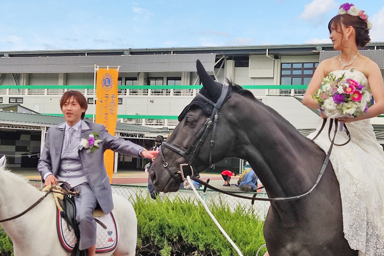 パドック・ウェディングでは、新型コロナウイルス感染症の影響で結婚式を出来ずにいたカップルを対象に、公募で4組を選出。松本眞尼崎市長の立ち会いの下、パドックをチャペルに見立てて馬車で入場し、式を挙げた。この中の一組の夫婦は車椅子で盲導犬と一緒に入場し、列席の方々から大きな拍手で迎えられて2人とも満面の笑みを浮かべていた。