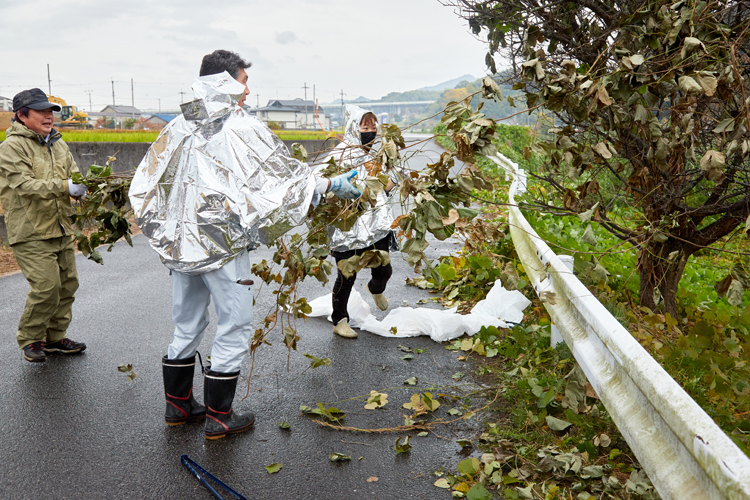今年度2回目の清掃活動は11月13日、小雨の降る中で行われた。午前9時に集合して、いつも通り川沿いの下草刈りとゴミ拾いを行ったが、この日はそれに加えて後日間伐する梅の木の選定も行われた。2018年9月、暴風で梅の枝同士が絡み合い、10本以上が根こそぎ倒れてしまったことがあった。関西国際空港の連絡橋に暴風で流されたタンカーが衝突する惨事を引き起こした、平成30年台風21号による被害だ。同様の事態が起こることを未然に防ぎつつ、木の成長を促すために、今期は予算をかけて間伐を行うことにしたのだ。