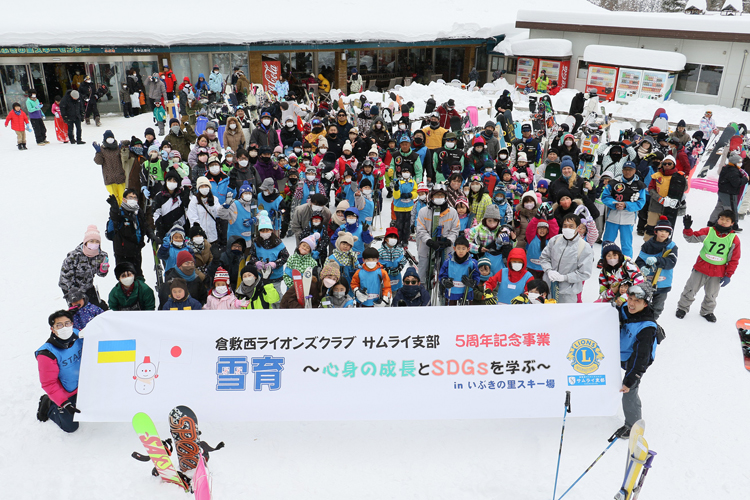 岡山県の県南地域は雪はほとんど縁がなく、雪に親しむ機会がない子どもが多い。そこで倉敷西ライオンズクラブ(平井弘明会長/45人)はサムライ支部(武政智哉支部長/8人)結成5周年記念事業として、子どもたちに雪と触れ合う機会を提供し、最近注目され始めた「雪育」を通して心身の成長と地球環境保護への意識を育むことを目的に、当県新見市にあるいぶきの里スキー場でスキー・スノーボード体験ツアーを開催した。また、ウクライナから岡山県に避難してきている親子も招待し、異国で不自由なことも多いだろう中で日本での楽しい思い出を作り、また日本の子どもたちと国際交流してもらう機会とした。