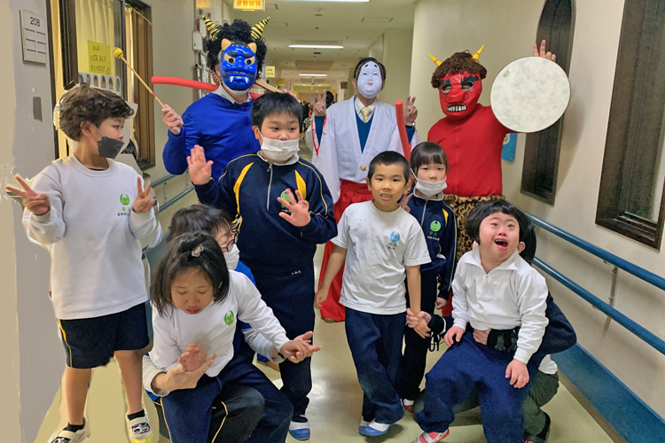 当日はメンバーが鬼と福の神に扮して、小学部(123人)の各教室(25クラス)を回った。子どもたちは、新聞紙で作った大きな豆を準備して待機。鬼が「良い子にしているか!」などと声を上げながら教室に入ると、子どもたちが「鬼は外!」と言いながら鬼に新聞紙の豆を投げる。あまり驚かしすぎないよう配慮はしているものの、中には鬼を怖がったり泣いたりする子もいて、てんやわんやの大騒ぎだ。