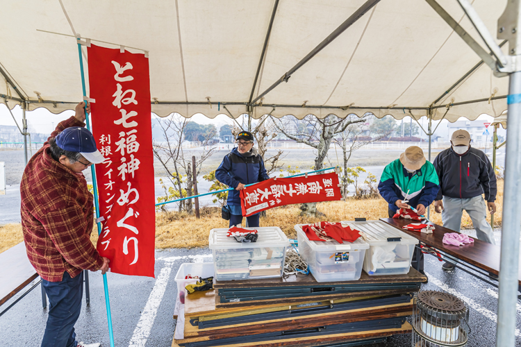 七福神巡りは、正月松の内(1月7日または1月15日まで)に福を招く七神が祭られた寺や神社を祈願して回ると、その年の福を授かるという信仰で、江戸時代に盛んになったと言われる。古くから続いている地域もあれば、町の活性化のために新たに始めるケースもある。利根ライオンズクラブのとね七福神めぐりはまさに後者。ライオンズ・メンバーが、町内外の人々に利根町の魅力を知ってほしいと企画し、作り出したコースを巡るもので、寺社から寺社へと徒歩で移動しながら、それまで気に留めていなかった地域の魅力に気付いてもらうことを期待した取り組みだ。