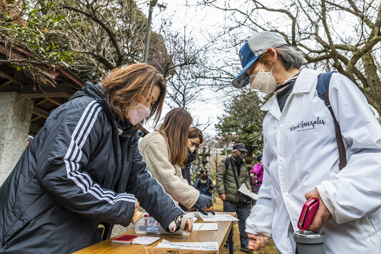 参加者は7カ所あるチェックポイントごとにスタンプを押してもらい、次の目的地を目指す。七福神を巡る過程で町の魅力に気付いてもらうことが目的の一つなので、コースマップには各寺社の見所などの説明を記載した。それによると、弁財天を祭る第二番の来見寺は徳川家康ゆかりの名刹(めいさつ)。境内には「松替えの梅」と呼ばれる梅の木がある。家康の目に留まった松の木を時の和尚が献上し、その返礼として江戸城から下された梅だと伝わっている。