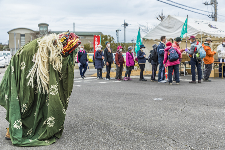 この日ゴール地点でにぎわいを添えたのは、協力団体の「利根やっこ睦(かい)」の面々。13kmを歩き切り福を授かった参加者は、新年にふさわしいお囃子(はやし)と舞で迎えられた。