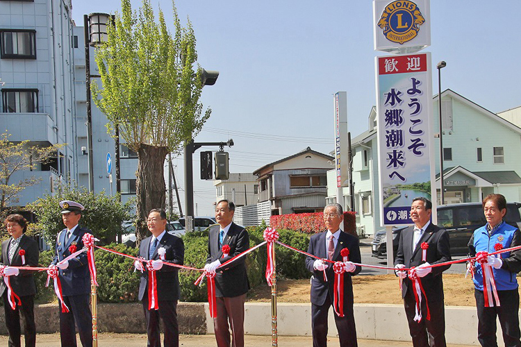 潮来ライオンズクラブ(江口誠一会長/106人)は今年度、結成20周年を迎えた。その記念事業の一つとして、JR潮来駅前のロータリーに交通安全標語を掲示した大型看板塔を設置し、春の交通安全運動に合わせた4月13日、除幕式を行って潮来市に寄贈した。