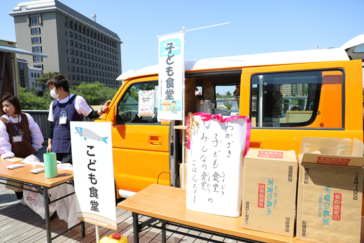 ◉こども食堂による「読み聞かせコーナー」。こども食堂の食事も体験してもらおうと、キッチンカーでカレーライスを提供した