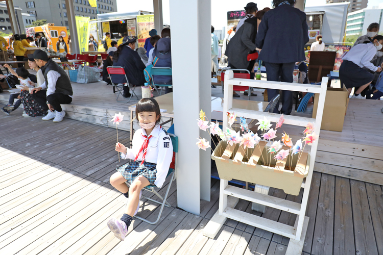 メインステージでは、次の四つの私立高校の生徒たちが、コロナ禍で発表の場を失った部活動の成果を披露した。岡崎城西高等学校・和太鼓部の和太鼓演奏、愛知産業大学三河高等学校・地域交流活動部のよさこい踊り、人間環境大学附属岡崎高等学校・ダンズ部のダンス、光ヶ丘女子高等学校・合唱部のハンドベル演奏と、書道部の書道パフォーマンス。ステージのフィナーレを飾ったのは、八重山民謡「芭蕉布(ばしょうふ)」の皆さん。唄、三線、太鼓、そして踊りも加わった本格的な構成だ。自然と体が動き出す沖縄の音楽に、会場内でも手をくねらせて踊り出す人が続出した。どのチームも、こどもの城橋が揺れんばかりの迫力満点。たくさんの観客を魅了した。
