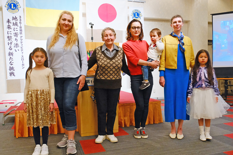 倉敷西ライオンズクラブ(平井弘明会長/44名)は、4月27日に開催したクラブ例会に、ウクライナから戦火を逃れて岡山に避難している2家族とその支援家族を招待した。例会は、メンバー全員が起立して拍手で歓迎する中をウクライナの方たちが入場し、ウクライナ国歌と君が代を斉唱してスタートした。