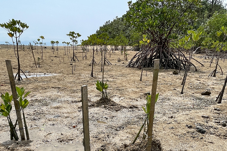 マングローブとは、熱帯・亜熱帯地域の淡水と海水が混ざり合う汽水域で群生する常緑樹の総称。ヤエヤマヒルギは沖縄本島以南に分布する日本産の高木で、八重山地域に多く自生し、マングローブの中でも特に塩分に強いため主に河口域で育つ。ただ、護岸工事で海岸の形が変わってしまったことなどから名蔵湾は波や風の影響を受けやすく、苗を植栽しても育つものは1割に満たないのが現状だ。植栽を始めた当初は苗をそのまま植えていたので更に活着率が低く、植えた翌日に大雨が降ってほぼ全てが流されてしまったこともあった。