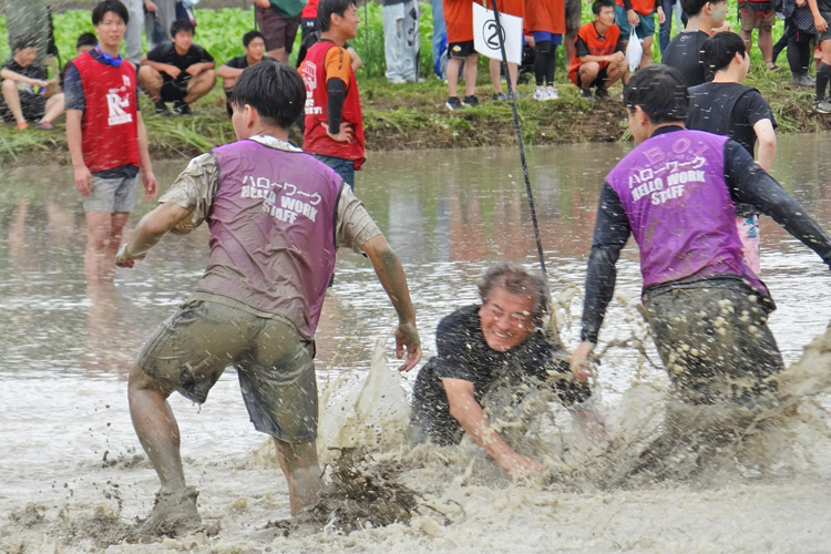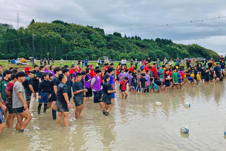 今回は、20m×12mの田んぼ4面を使用。服装は、チームごとにTシャツやビブス、ラグビージャージなどで上半身を統一してもらい、安全面から靴は必ず着用とした。と言っても、泥に足を取られて靴を紛失する人が多く、皆で泥の中を探し回るのも恒例だ。各チームが2試合ずつ行うが、楽しむことが第一目的なので勝敗は決めない。ラグビー経験がない人でも楽しめるように、タックルの代わりにタッチとし、4回タッチで攻守交代するなどのルールも設定した。