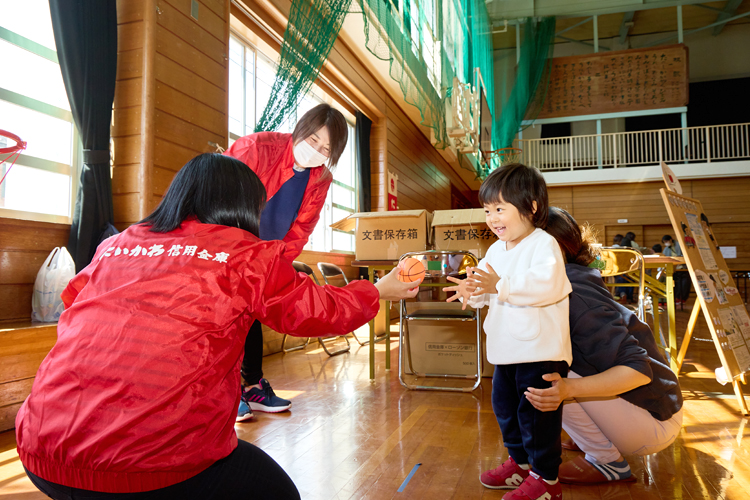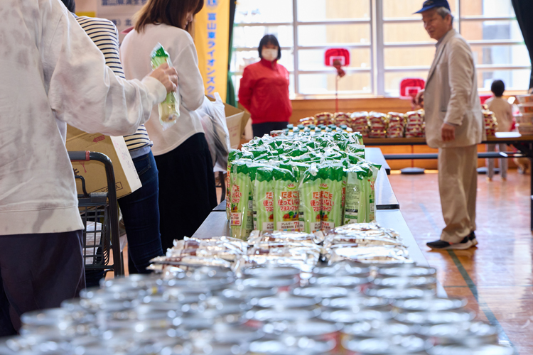 会場の清水町地区体育館は、統合によって閉校した小学校の体育館だった施設。広い館内に配置された机の上には食料品や生活雑貨が整然と並び、受け付けを済ませた親子はカートを押しながら品物を一つひとつ確かめ、箱に入れていく。子どもが途中で飽きてしまってもいいように、会場にはスーパーボールすくい、輪投げなどのゲームコーナーや、綿あめ、おでんの屋台ブースを設けるなど、親子で楽しめる場も設けた。会場設営や来場者への応対には、7クラブのメンバー51人と、富山国際大学子ども育成学部の学生ら10人で当たった。13時から15時までの開催時間内に、事前登録した141家族が来場し、会場は大盛況となった。