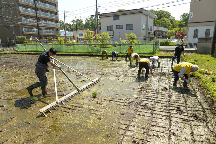 田植えが終わると、苗が水没しない程度に水を入れて、その状態を維持。好天が続くとすぐに水田が乾いて干からびてしまうので、油断は禁物だ。というのも、このゆめ田んぼは、通常の水田のように用水路から水を引いているわけではないので、放っておくと水が地中に染み込んでなくなってしまうのだ。そのため、適宜水道水を入れなければならず、お盆過ぎまでは、3日に1回は水位をチェックする日々が続く。水の管理以外にも、農業関係のメンバーが中心となって収穫まで稲の世話は続く。