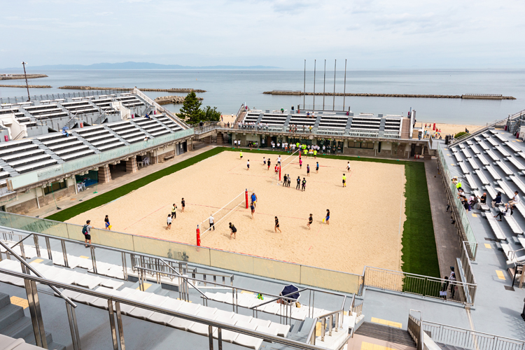 大阪湾に面する岬町は和歌山県との県境に位置し、海岸からは淡路島の島影と、湾内に浮かぶ関西国際空港が望める。1997年、岬町と隣の阪南市にまたがって府営せんなん里海公園が整備された。その主要施設として岬町内に建設されたのが、ビーチバレー競技場「潮騒ビバレー」だ。日本では初めて、世界でもアトランタに次いで2番目に出来た常設の競技場で、コート2面と3000人収容の観客席を備える。