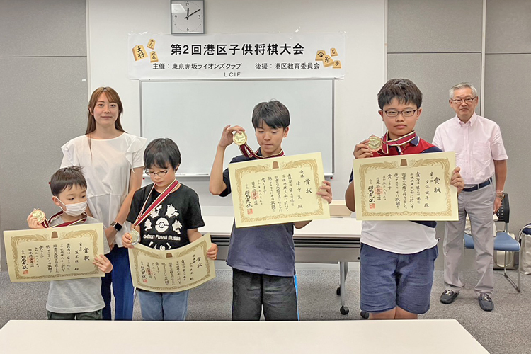 気温30度を超える真夏日が続く中だったが、当日は港区内の五つの小学校から6~12歳までの児童約40人が保護者等と一緒に参加した。藤田指導棋士によるルール説明の後、くじ引きで対戦相手を決めてトーナメント方式による親善競技がスタート。対局時間は40分とし、残り時間10分を切ってからは30秒のタイマーを使用した。子どもたちは暑さも忘れた様子で、真剣に将棋の盤面に向き合っていた。また、室谷女流三段による指導対局として、1回戦敗者のうち早く終了した4人を相手にした多面差しも行われた。対局終了後には、優勝、準優勝と3位、4位の児童に記念のメダルと日本将棋連盟の羽生善治会長の署名が入った賞状が贈られた。当クラブからは記念品として参加者全員に、国産タオルハンカチ、ライオンズのロゴ入りボールペン、将棋の駒をデザインした木製の箸を贈呈した。