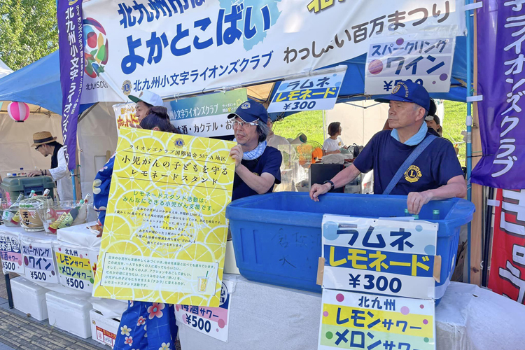 8月4~6日、北九州市を代表する祭りの一つ、第36回わっしょい百万夏まつりが開催された。北九州小文字ライオンズクラブ(櫨本健一会長/55人)は2日間、事業資金獲得を目的とした出店を行った。内容は、ホットドックと地酒の販売、そして特に注目すべきは小児がん啓発・支援のためのレモネードスタンドの設置である。