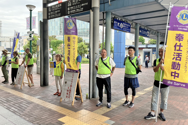 当日の10~15時、岡山駅東口のエスカレーター下り口付近に、「ハワイ・マウイ島大規模火災支援募金」の看板を設置。クラブ名と奉仕活動中の文字が入ったのぼり旗を掲げ、通行する人たちに協力を呼びかけた。小さな子どもから年配の方まで多くの方々が足を止めてくれ、たくさんの温かいご支援を頂いた。協力してくださった方々に、心から感謝申し上げる。この度の活動で集まった浄財は全て、ライオンズクラブ国際財団(LCIF)を通じて被災地域への支援に役立てる。