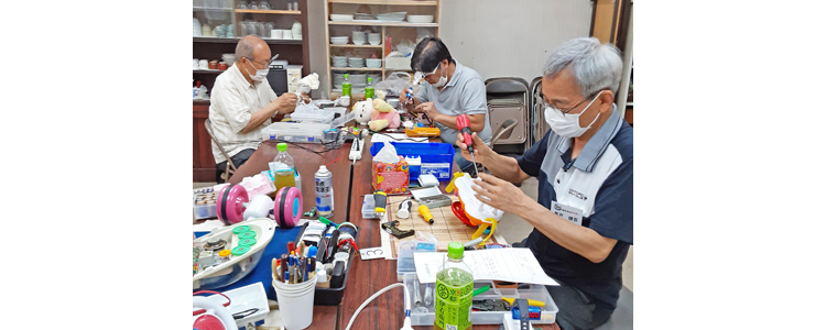 基山(きやま)ライオンズクラブは20余年にわたり「おもちゃ病院」という奉仕活動を続けています。壊れてしまった大切なおもちゃを治療するというもので、2013年3月に病気で亡くなられた当クラブの故音納貞夫さんが、福岡県大宰府市の「いきいき情報センター」でされていたおもちゃのドクターの活動を、基山町でもスタートさせました。現在活躍されているおもちゃのドクターは5人。皆定年後に、好きな機械いじりの技術を生かすなどして始められた方たちで、ライオンズのメンバーではありませんが当クラブの活動に協力してくれています。音納さんは以前、クラブ会報に次のような文章を寄稿されたことがあります。