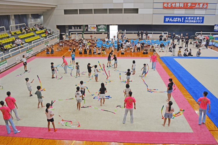 参加対象は新体操に興味がある小中学生で、新聞への告知掲載やチラシの配布で募集し、63人が参加した。当日はまず、鈴木選手や高校生・大学生選手による迫力ある模範演技を鑑賞し、その後、2グループに分かれて新体操教室を行った。限られた時間の中、鈴木選手を始めとする講師の皆さんは新体操の楽しさを伝えようと熱心に指導してくださり、子どもたちは興味津々の様子で、楽しそうに体を動かしていた。