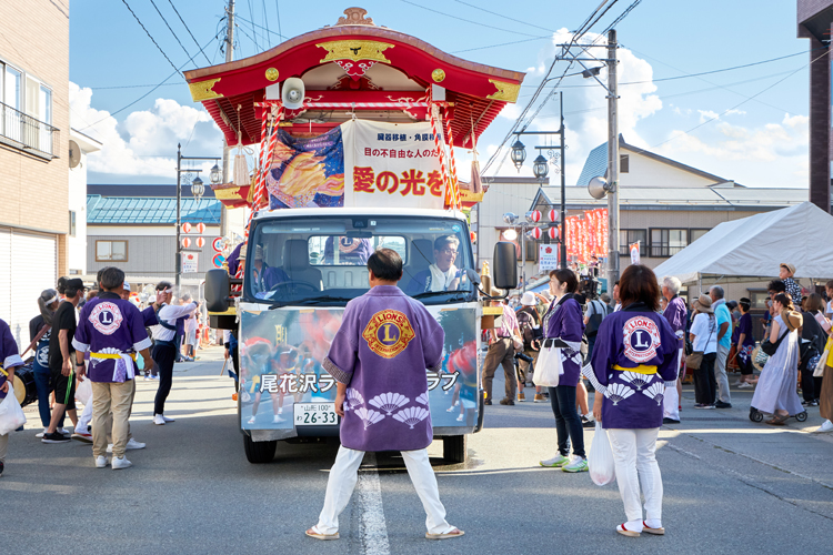 祭りは大きく2部構成になっている。27日に行われるのは、市中心部に鎮座する諏訪神社の例大祭。御輿や山車、秋の豊作を祈念する豊年踊りの行列が練り歩く。28日には花笠踊り大パレードが市内の目抜き通りで行われ、市内外からの参加団体約1700人が躍動感あふれる踊りを披露した。その大パレードの先導役を務めるのは、尾花沢ライオンズクラブ(加藤克彦会長/45人)の囃子(はやし)屋台だ。