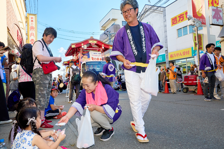 以前は屋台の上からメンバーが餅をまくのが恒例だった。五穀豊穣を祝い、祈願する餅まきだが、人が群がって危険だという理由で、最近はメンバーが手渡しで配っている。