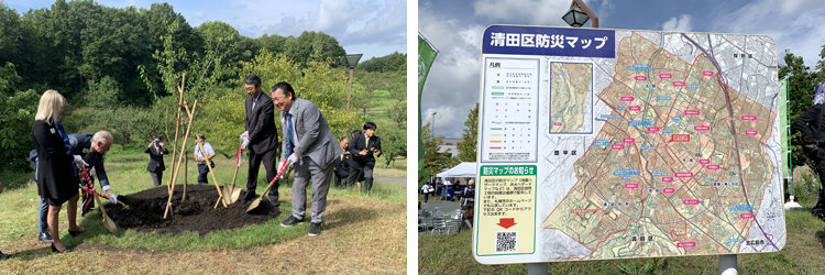 札幌では2018年の北海道胆振(いぶり)東部地震に対するLCIFの被災地復興支援を振り返り、LCIF災害交付金を活用して再建した平岡公園(札幌市清田区)の東屋(あずまや)とかまど型ベンチを視察しました。理事長夫妻による記念植樹も行われ、2025年に開催される札幌OSEALフォーラムのすばらしいキックオフにもなりました。また、当時の地震で被害の大きかった清田区の区役所前に設置されたハザードマップも視察。表側は避難場所や警戒区域などが示された地図、裏にはライオンズクラブの説明や胆振東部地震に対するLCIF及び全国のライオンズからの支援で設置されたことが書かれており、市民への周知にも役立っていることを確認しました。
