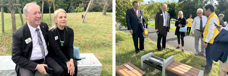 西日本の公式訪問では、滋賀県草津市のロクハ公園で植樹と環境整備に取り組むライオンズの活動を視察しました。公園に到着後、理事長夫妻は草津ライオンズクラブの案内で公園内を自転車で移動し、つかの間のサイクリングを楽しまれました。同クラブは2年前にシェアリング交付金を利用して石材ベンチを寄贈。同時期に災害に備えてかまど型ベンチも駐車場横に寄贈しています。