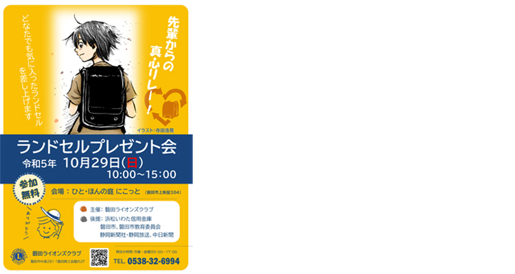 告知方法としては、案内チラシ(磐田市内在住の漫画家・寺田浩晃さんが挿絵を描いてくださった)を市内の幼稚園、保育園、こども園で年長組の全員に配布し、交流センター(公民館)、図書館、公共施設、浜松いわた信用金庫などでは設置や掲示をしてもらった。また当市にはブラジル人が多く暮らしていることから、ポルトガル語のチラシも作成。「広報いわた」にも掲載された。磐田市、市教育委員会、浜松いわた信用金庫、静岡新聞社、静岡放送及び中日新聞東海本社の後援も得た。公的機関を始めとする後援があることで、信用され安心してもらえると考えたからだ。ランドセルプレゼント会を行うことがメディアで報道されると、「使ってください」と20個のランドセルが届き、計76個を用意出来た。