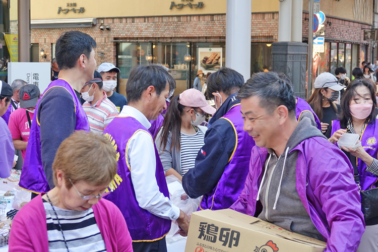 授産施設の皆さんはバザーで、パンやクッキー、ラスクなどの食品の他、トートバッグやアクセサリーなどさまざまな商品を販売。当クラブは卵の特売を実施し、またメンバーたちはお客様の呼び込みに一役買った。2日間にわたる祭りの中でチャリティーバザーが行われたのは1時間だけだったが、4年分の思いを込めて、コロナ禍中は難しかった声かけを精いっぱい行った。バザー終了後、五つの授産施設へ支援金を贈呈した。
