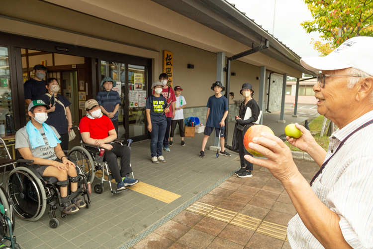 9月19日、この青森市浪岡交流センター「あぴねす」のりんご園地で、県立浪岡養護学校中学部の生徒がリンゴの収穫を体験した。これは、青森ねぶたライオンズクラブ(小倉尚裕会長/35人)が支援する同校の体験学習の一環で、5月の人工授粉、7月のリンゴへの絵付けに続いて行われた授業だ。