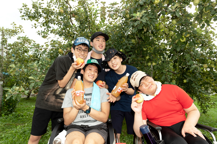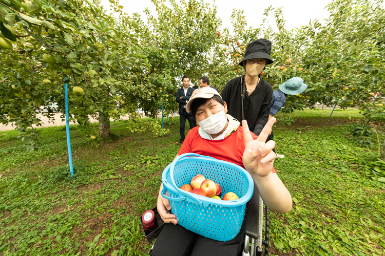 バリアフリー対応の園地では、歩道からリンゴの木の下へ車いすに乗ったままで行くことが出来る。もぎ取り開始の合図があるやいなや、生徒たちは7月の授業で絵付け用シールを貼ったリンゴの木へと走り寄った。今年の夏は例年に比べて朝晩の寒暖差が小さかったため色付きが悪く、色の薄いものは甘さも控えめだという。生徒たちは絵付けをしたリンゴの他にも、赤く色付いたものを探してはもぎ取っていった。