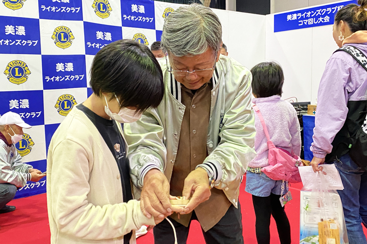 美濃ライオンズクラブ(高綱恒夫会長/30人)は11月12日、美濃市運動公園一帯を会場に開かれた「美濃市総合フェア」で、「市民ふれあいコマ回し大会」を開催した。市内産業の活性化と市民の健康、防災意識の向上を図るこのフェアには毎年多くの市民が訪れ、さまざまな展示や体験の催しに参加している。当クラブは会場の一つとなっている体育館の一角で、近年はコロナ禍による制約で取り組めていなかった市民交流を目的に実施した。