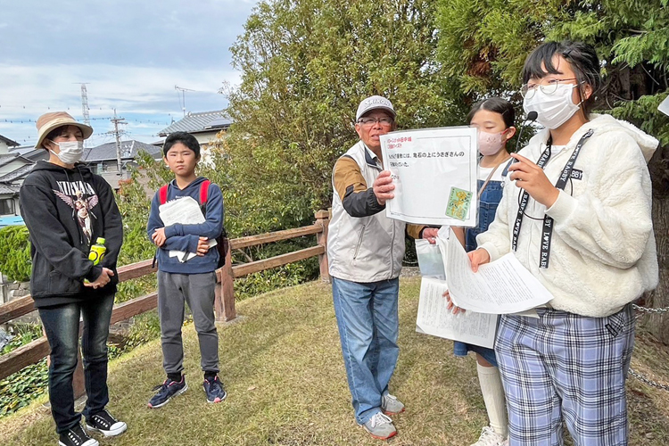 11月12日には、藤枝市主催の東海道界隈(かいわい)をフィールドとした体験交流プログラム「みちゆかし」の一環として、「家康もあやかったパワースポット田中城の御城印がもらえるご利益ウォーキング」を実施。NHK大河ドラマ『どうする家康』の主人公・徳川家康が好んで訪れたとされる田中城周辺の史跡やパワースポットを巡った。当日は天気に恵まれ、絶好のウォーキング日和だった。参加者は予定していた30人を超える40人がエントリー。4グループに分かれ、クラブメンバーのガイドでウォーキングを実施した。地元の小中学生を「歴史ナビゲーター」として迎え、彼らが学んだ郷土の歴史を参加者に伝える機会も設けた。子どもたちは自宅でしっかりと準備をして発表に臨んだ。子どもたちが地域の歴史をより深く理解し、自分の言葉で伝える貴重な機会になったと思う。参加者からは、ガイドの質の高さとプログラムの充実度に対し非常に高い評価を頂いた。特に歴史ナビゲーターによる史跡案内は好評で、ウォーキングを楽しみながら地元の歴史への理解を深めたようだ。