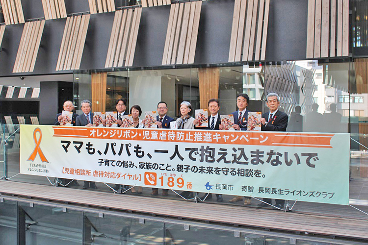 長岡長生ライオンズクラブ(105人)は今年度、地域における「オレンジリボン運動」の認知度向上を推進する事業を展開している。2004年、栃木県小山市で3歳と4歳の幼い兄弟が父親の友人から繰り返し暴行を受け、息も絶え絶えの状態で橋の上から川に投げ込まれて幼い命を奪われるという痛ましい事件が起きた。二度とこのようなことがあってはならないと、子どもの虐待防止を呼びかける市民運動「オレンジリボン運動」が全国でスタート。シンボルマークのオレンジリボンと児童相談所虐待対応ダイヤル189(いちはやく)を広めることで、多くの人に子ども虐待の問題に関心を持ってもらい、虐待のない社会を築くことを目指している。