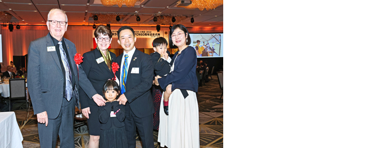 しかしながらその間には新型コロナのパンデミックに見舞われ、開催の規模のみならず可否すら計れない状況が続きました。とても苦しんだ当時のことが、昨日のように思われます。幸運にも23年5月、日本における新型コロナの位置付けは5類に移行。無事に多くの来賓に案内を送り、当日は260人ものご参加を賜り感慨深い一日となりました。式典は「家族でお祝い」のコンセプトで構成、簡素かつ恒例の手順で進行するよう配慮しました。君が代とカナダ国歌(英語)を全員で斉唱出来るように練習を重ね、メンバーから選出したソングリーダーが登壇して生ピアノの伴奏のみで会場全員が一体となる、そんなおもてなしを表現しました。クラブ会長や来賓あいさつに続いて、姉妹クラブのエドモントン・ホスト ライオンズクラブ代表としてパティ&グレッグ夫妻のあいさつがあり、バナーと記念品を頂きました。その後、今度はパティ・ヒル国際会長として祝辞と記念品を授与され、参加者全員に国際会長記念ラペルピンを贈られました。
