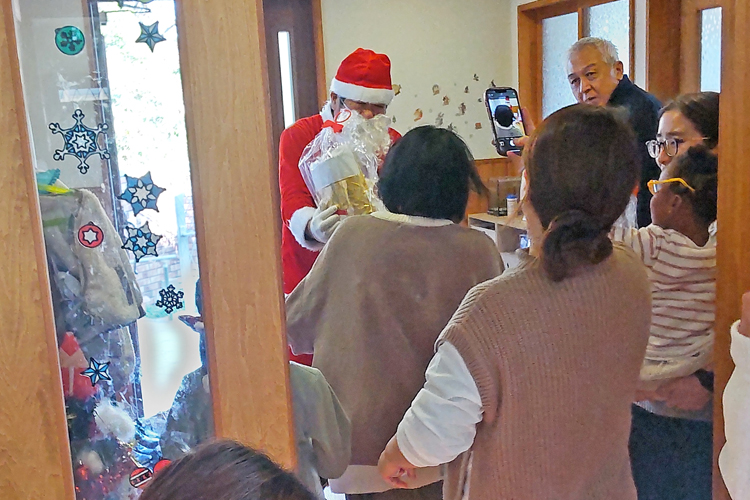 いよいよクラブメンバーが扮するサンタクロースがチャイムを鳴らして玄関から入ってくると、子どもたちはビックリ! 3歳の子は突然の訪問者に驚いて泣きながら職員の陰に隠れてしまったが、菓子が入ったクリスマスブーツを一人ひとりにプレゼントすると、子どもたちはブーツの大きさと同じくらいに喜びも大きかったようで、両手にかかえて満面の笑みではしゃいでいた。小学生9人と中学生、専門学校生1人ずつはメンバーとオセロゲームなどもして、午後1時半まで皆で一緒に楽しんだ。最初はやや緊張した面持ちだった子どもたちも、帰り際には玄関の外まで見送りに出て皆笑顔で手を振ってくれた。