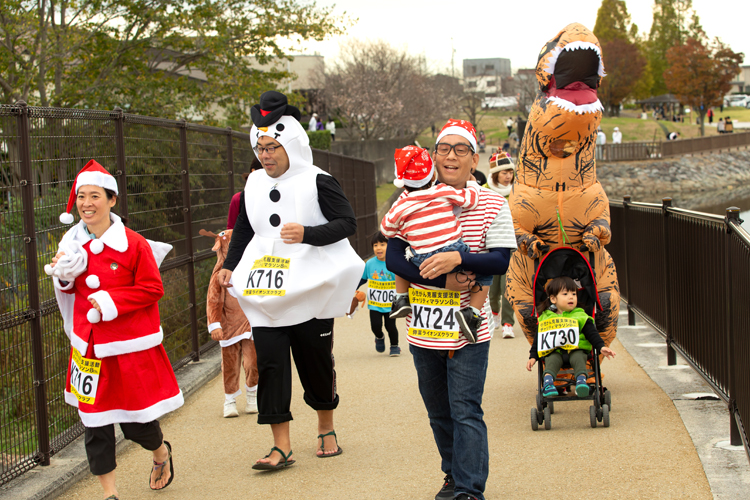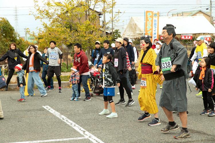開会式会場に集まった参加者の中には、好タイムを狙って入念なストレッチをするランナーもいれば、時代劇から抜け出てきたような着物姿や人気アニメのキャラクターなど、凝った扮装で登場したランナーもいる。ファミリーの部には、3歳から小学生以下の子どもも参加出来るとあって、クリスマスや恐竜など、テーマでそろえたコスチュームに身を包んだ家族もいて、始まる前からほのぼのと楽しい雰囲気が漂っていた。