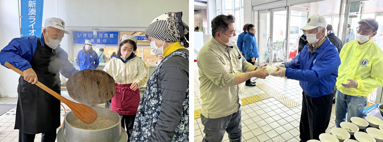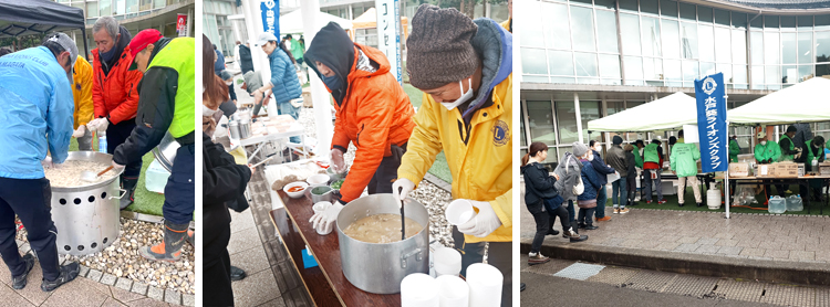 炊き出しには新湊ライオンズクラブのメンバー11人の他、小杉ライオンズクラブから7人、となみセントラル ライオンズクラブから3人の応援も駆け付け、豚汁約150食を用意。受け取ったボランティアからは、「体が温まる」「午後からもがんばろうという気力が湧く」などと感謝された。
