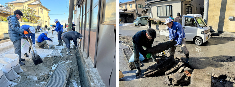 作業には両クラブの他、市内のパキスタン人やバングラディシュ人らで作る富山国際社会団体のメンバーや一般ボランティアも参加し、泥をスコップでかき出して土のう袋に入れ、集積場へ運んだ。また、地震の影響で亀裂が入った道路上のコンクリート塊を取り除く作業も行った。一帯には大きく傾いた電柱や危険を示す赤い張り紙が貼られた住宅もあり、射水市内でも深刻な被害を受けた場所があることが分かった。両クラブは今後も、積極的に活動を継続するとしている。
