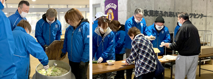 また1月13日には、避難所となっている氷見市ふれあいスポーツセンターで炊き出しを行った(写真)。この避難所では自衛隊による炊き出しは1週間で終わり、その後はアルファ米やインスタントみそ汁などを提供しているとの情報を氷見市から得て実施したもの。当日は雪の降る寒い日で、大鍋で100人分の豚汁を作って助六寿司と一緒に提供し、避難している人たちから感謝の言葉が寄せられた。この日は姉妹クラブである長野県・大町ライオンズクラブが米300kgを届けに来て、支援物資として氷見市に寄贈した。