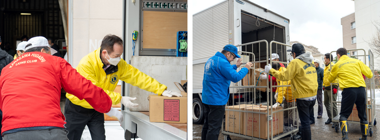 金沢市では市民や企業、団体などからの救援物資を災害備蓄倉庫で受け入れ、仕分けした後に物資拠点となっている石川県産業展示館に運搬している。物資仕分けは1月6〜10日、1月14〜15日にも行われ、ライオンズメンバーは市職員や青年会議所のメンバーと共に作業に当たった。