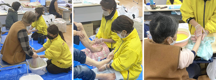 2月25日、333-E地区(茨城県)FWTのグループが、石川県能登町の避難所になっている小間生(おもう)公民館で足湯マッサージを提供した。長引く避難生活で冷え切った心と体を温めてあげたいと、長年看護師を務めていたメンバーが提案し、渡辺まり恵地区SCP・FWT委員長(つくばOAKライオンズクラブ)ら4人が参加して実施した。