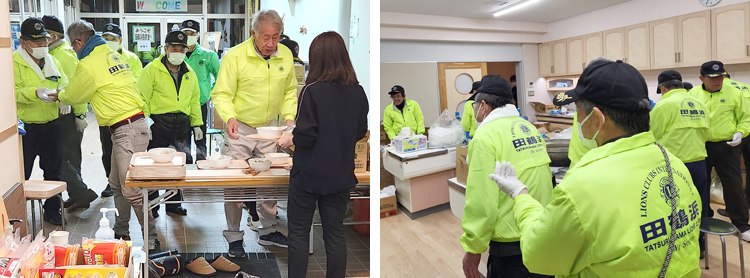 田鶴浜ライオンズクラブでは会員30人全員が被災。1月から例会を開けない状況の中、会員同士の意見交換が必要だと、2月8日に全体会を開催した。自宅が半壊・全壊した会員は出席出来なかったものの、被害が一部損壊に留まった会員15人が集まった。この会合でライオンズとして復興に向けて何が出来るかを話し合い、避難所での炊き出しの実施を決定。メンバーが経営するスーパーで材料を調達しておでんを作り、避難者へ振る舞った。